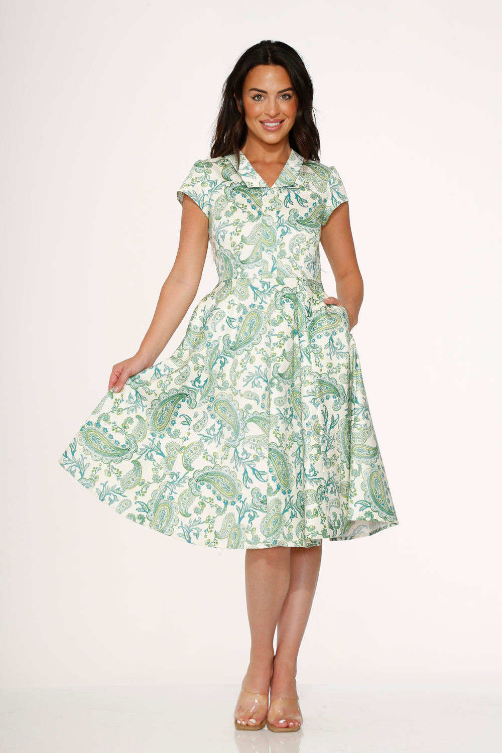 Make a bold, retro-inspired statement in the Green Paisley Swing Dress by Orchid Bloom. Featuring a rich green base adorned with a classic paisley print, this vintage-style swing dress is perfect for adding personality to your everyday wardrobe.