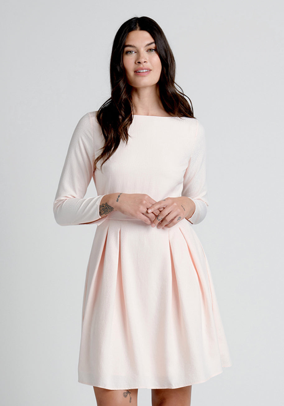 Presenting in the prettiest of pale pinks, we offer you this beautiful fit-and-flare dress from our ModCloth namesake label. Created to highlight your most special occasions, the bodice of this A-line dress features a bateau neckline with back button closure, a keyhole cut-out at the back, and ? sleeves with slits in the cuffs. The skirt is knee-length with thoughtfully placed darts at both hips for a figure-flattering silhouette, and boasts a vintage-inspired high-waistline. Full of subtle sweet detail, all this soft woven dress really needs to take the cake is you!