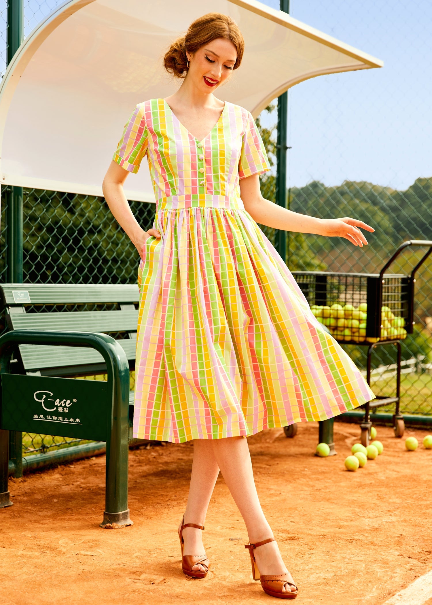 So full of sunshine and sweetness, this retro-inspired midi dress from our ModCloth namesake label is covered throughout with a prismatic checked print in summery shades of lavender, pink, orange, green, and yellow. Made from a woven cotton fabric, this fully-lined plaid dress boasts short sleeves, a stylish V-neckline, a semi-fitted bodice with functional front button closure, and an ample, gathered midi skirt complete with hidden side pockets.