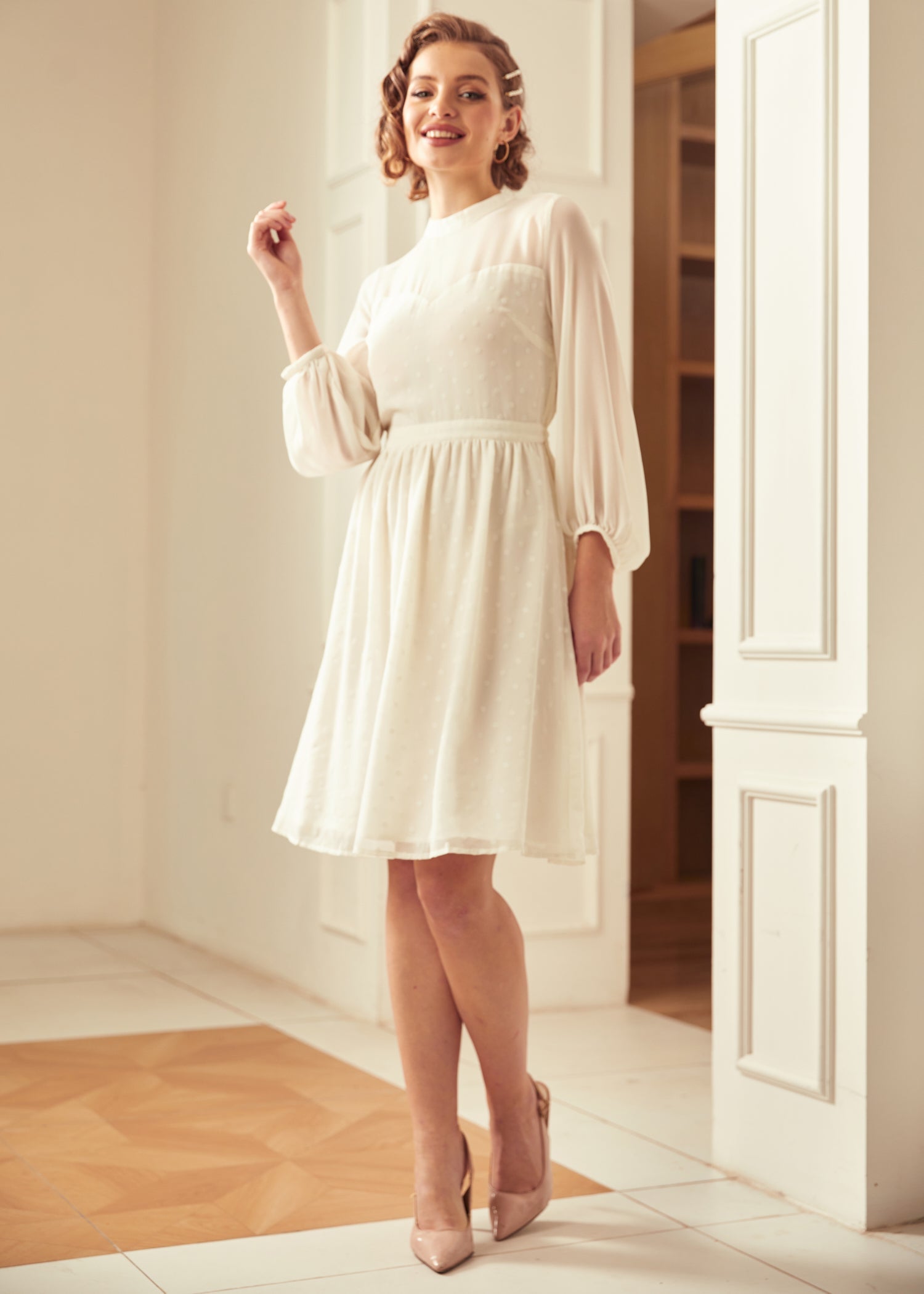 You¡¯re such a stunner on your special day in this ivory-hued chiffon fit-and-flare dress from our ModCloth namesake label. To complement your effervescent elegance, this dress was created with a sheer yoke with a sweetheart silhouette at the chest line, sheer 3/4 blouson sleeves, and a high neckline with button closure that creates a keyhole cut-out to beautifully accent the back. The ivory bodice features an ivory polka-dot print that leads to a shirred high-waistline and a fabulous mid-length flare skirt. You are picture-perfect in this gorgeous A-line dress, and ready to celebrate a very precious occasion.