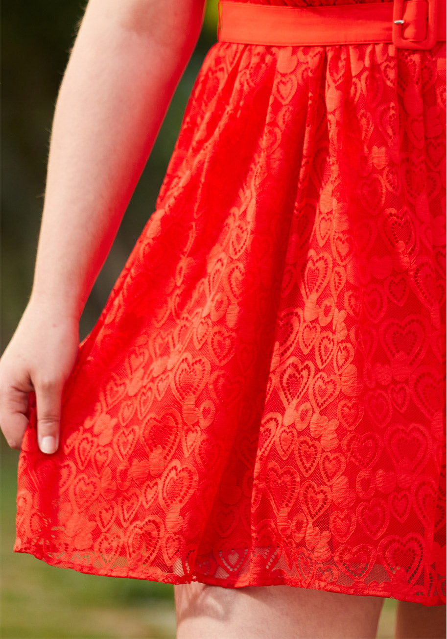 A vintage silhouette is given a strappy modern edge with this vibrant red fit-and-flare dress from our ModCloth namesake label! Made from a gorgeous lace with an exclusive hearts design throughout, this fully-lined mini dress boasts a flattering square neckline with wide shoulder straps with eye-catching, adjustable hardware at the back for fun and ease-of-fit! Boasting back-zip closure, a removable solid red belt, and a gathered high-rise waistline that leads to a perky above-the-knee skirt, this fiery red mini dress doesn¡¯t miss a beat!