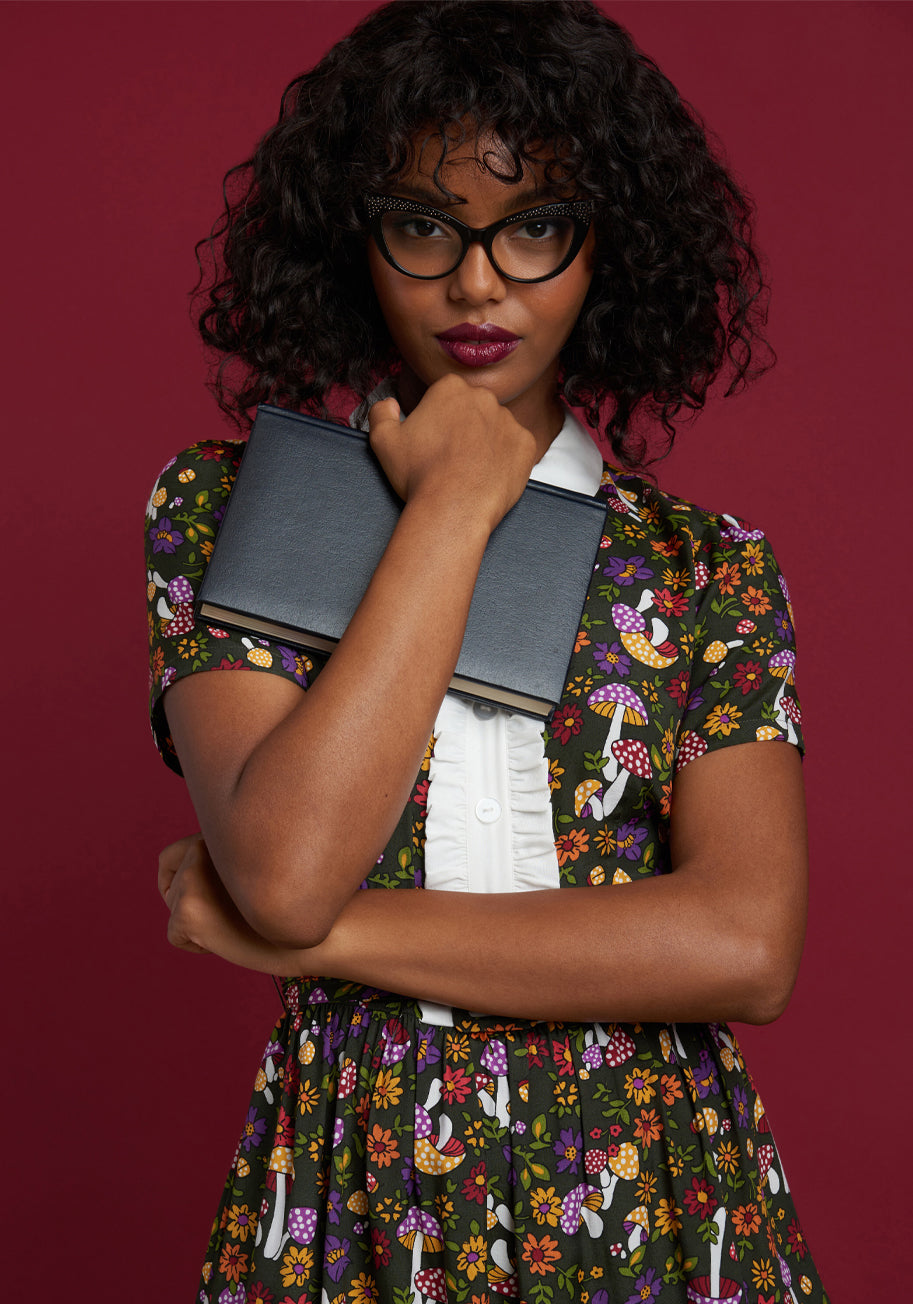 In an homage to our original logo, we fondly present you with a gorgeous new, hand-drawn print featuring a plush moss green forest floor full of adorable button mushrooms capped in shades of red, yellow, and purple that are surrounded by cheerful flowers and little baby beetles. Made from a lightweight woven fabric, this darling fit-and-flare dress is outstanding with its contrasting white point collar and ruffle-trimmed placket of buttons at the bodice. Boasting short sleeves, and a matching and removable belt at the gathered waistline that leads to an above-the-knee flare skirt with handy side pockets, this 70¡¯s inspired mini dress is an easy ¡°yes.¡±